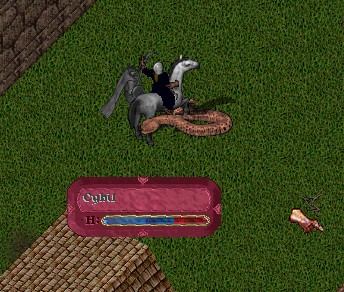 Tired of this game Pe Ell continued back down the road. After a conversation with someone out looking for gypsy chests to pick, he came upon some reds hunting for victims along the road. Two reds and a blue assisting them in fact. Pe Ell stayed near them, moving silently hidden all the while. There was a lull in travelers and one of the reds grew bored and attacked a giant serpent. Pe Ell followed her as she left her companions to deal with the serpent.