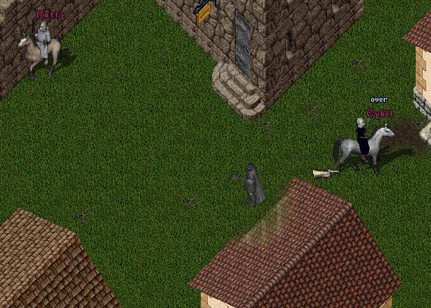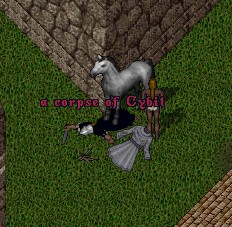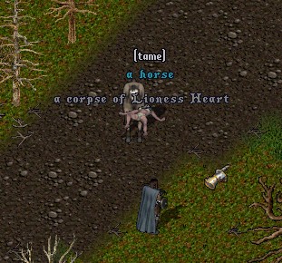 Back down near the guard tower Pe Ell saw someone named "outcast" standing on the porch of a vendor shop perusing their wares. Pe Ell stood in front of the steps where outcast walked into him on his way out. Pe Ell then moved. outcast began searching, first by moving around, then by casting reveal in multiple locations. Not an ignorant fellow - he knew he was looking for a stealther. He quickly gave up and headed down the road. Pe Ell followed, then ran up and told him it isn't very easy. The gentleman replied that he did realize that. Pe Ell and outcast stood on the road for some while when two people (Genesis Rage and Lioness Heart) came along and suddenly attacked them both. First Genesis Rage attacked outcast, then Lioness Heart attacked Pe Ell. Both were mages. Pe Ell said, "I don't think they like us.", then charged at Lioness Heart. He struck her twice, wounding her and infusing her blood with deadly poison. She ran and Pe Ell followed. She was able to keep ahead on her horse, but not by much. She could nay afford to stop else Pe Ell would be upon her. The poison ended her life.
