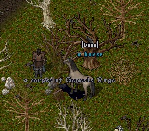 As Pe Ell grabbed a pouch from Lioness Heart's corpse, Genesis Rage arrived. Seeing Pe Ell and Lioness Heart's corpse he paused to consider, but Pe Ell was already charging at him. He attempted momentarily to put up a fight, and managed to paralyze Pe Ell before he could get close. As Genesis Rage meditated to regain mana, Pe Ell thought about the pouch he'd just picked up from Lioness Heart. Just maybe....Pe Ell opened the pouch and there was a reverberating boom as Pe Ell was freed from his paralysis. Pe Ell immediately charged at Genesis Rage who attempted to flee. He failed to make it far.