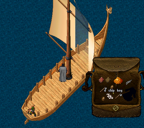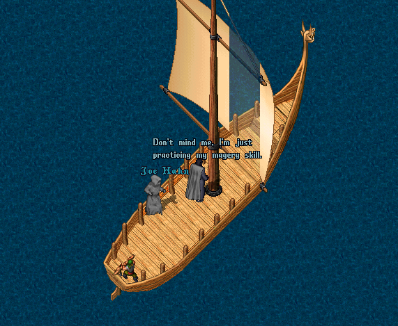 Victor was out practicing meditation on his boat when another boat sailed by. Victor could not help but to notice that the other boat's plank was down! Victor then sped up and moved his boat into the path of the other boat and came to a full stop. The other boat stopped as well, but the passengers seemed not to notice. Onboard was someone named Coriorhor who was apparently attempting to use bandages on a ghost by the name of Joe Hahn. Victor jumped onto their open plank and approached them. Quickly checking the contents of Coriorhor's pack he noticed the boat key! Well, this was just too much, and Victor began casting a hail of spells that quickly killed Coriorhor, despite his sudden awakening and attempt to flee.
